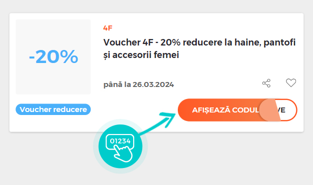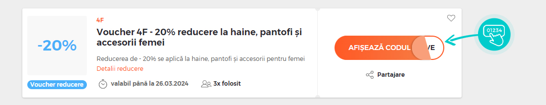 Selectați codul reducere concret de pe pagina noastră, pe care doriți să-l aplicați în magazinul online 4fstore.ro. Faceți click pe butonul portocaliu „Afișează codul”.