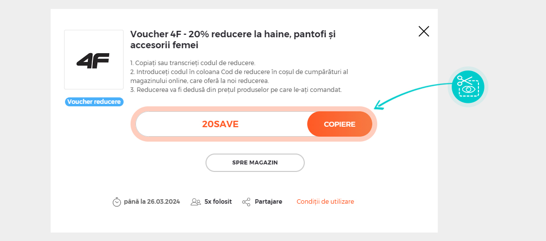 Copiați sau transcrieți cod reducere și faceți click pe butonul portocaliu „Transfer în magazin“, ulterior veți fi redirecționat direct în magazinul online 4fstore.ro.