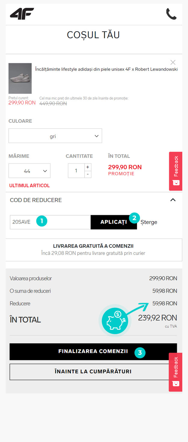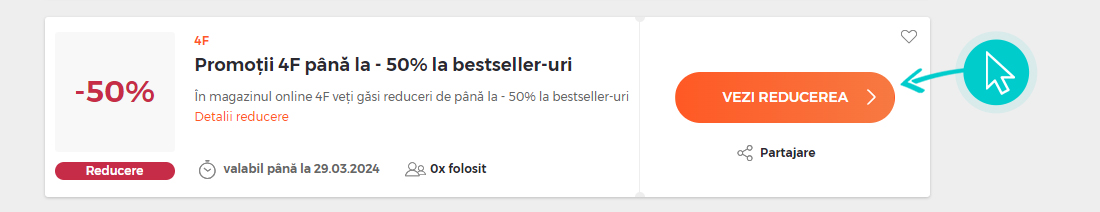 Alegeți o reducere 4F concretă de pe pagina noastră faceți click pe „Vezi reducerea“ și veți fi redirecționați în mod automat în magazinul online 4fstore.ro direct la oferta promoțională, de unde puteți cumpăra produsul dorit la reducere.