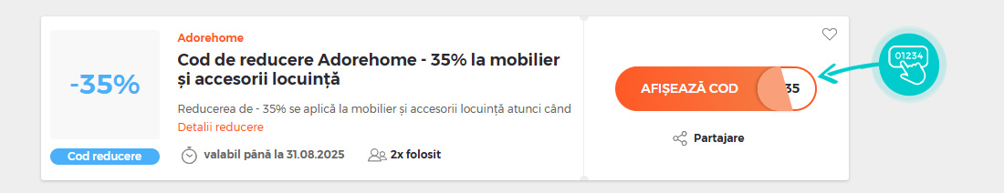 Selectați cod reducere concret de pe pagina noastră, pe care doriți să-l aplicați în magazinul online Adorehome.ro. Faceți click pe butonul portocaliu „Afișează codul”.