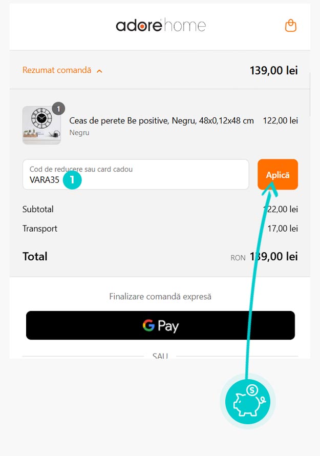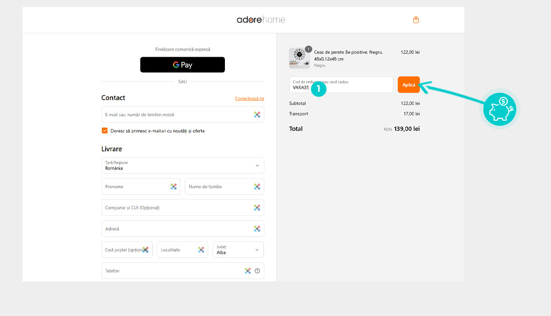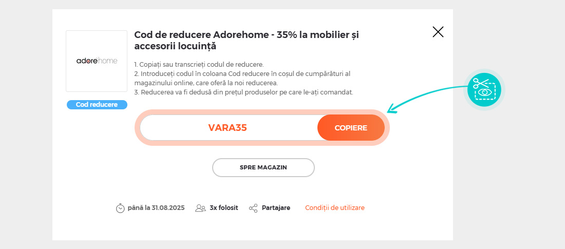 Copiați sau transcrieți cod reducere și faceți click pe butonul portocaliu „Transfer în magazin“, ulterior veți fi redirecționat direct în magazinul online Adorehome.ro