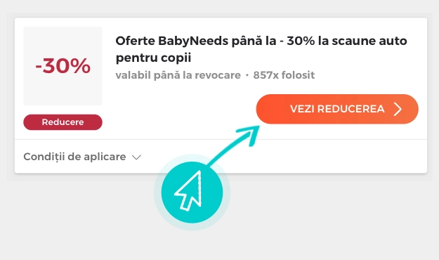 Alegeți o reducere Babyneeds concretă de pe pagina noastră faceți click pe „Vezi reducerea“ și veți fi redirecționați în mod automat în magazinul online Babyneeds.ro direct la oferta promoțională, de unde puteți cumpăra produsul dorit la reducere.