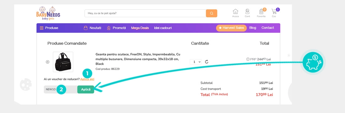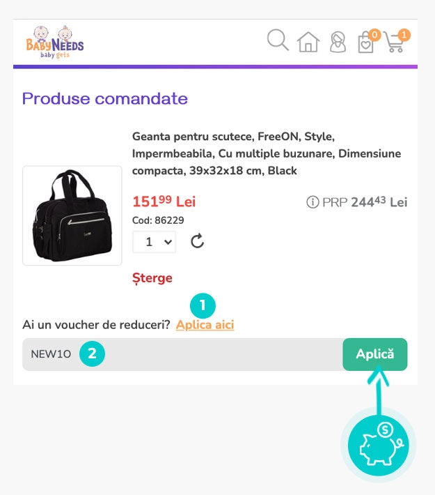 Alegeți produsul care vă interesează în magazinul online Babyneeds apăsați butonul „Adaugă în coș” și produsul se va introduce automat în coșul de cumpărături. În coșul de cumpărături sub produsul ales de dumneavoastră se află o rubrică „Cod voucher“. Aici veți introduce codul reducere copiat sau îl transcrieți manual și confirmați prin butonul “Aplică voucher“.