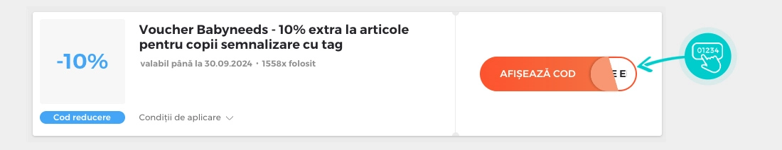 Selectați codul reducere concret de pe pagina noastră, pe care doriți să-l aplicați în magazinul online Babyneeds. Faceți click pe butonul portocaliu „Afișează codul”.