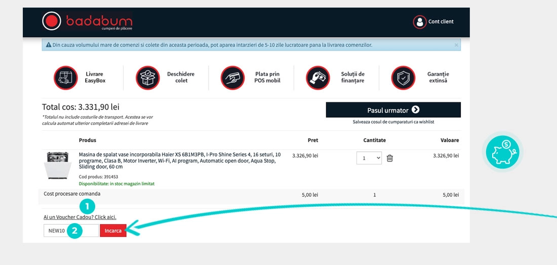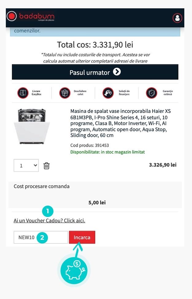 Reducerea - 10% se aplică la electrocasnice Haier în magazinul online Badabum atunci când introduceți codul de reducere în coșul de cumpărături. Folosiți voucher Badabum și cumpărați electrocasnice mai ieftin.