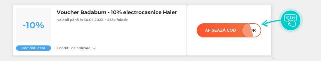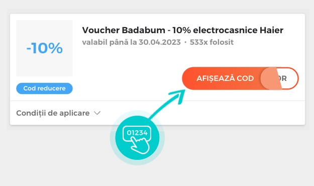 Valoarea reducerii: -10%Reducerea - 10% se aplică la electrocasnice Haier în magazinul online Badabum atunci când introduceți codul de reducere în coșul de cumpărături. Folosiți voucher Badabum și cumpărați electrocasnice mai ieftin.