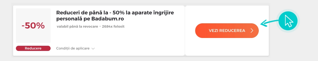 Alegeți o reducere Badabum concretă de pe pagina noastră faceți click pe „Vezi reducerea“ și veți fi redirecționați în mod automat în magazinul online Badabum direct la oferta promoțională, de unde puteți cumpăra produsul dorit la reducere.
