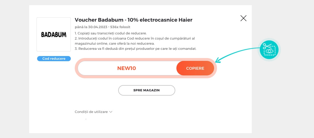 Copiați sau transcrieți codul de reducere și faceți click pe butonul portocaliu „Transfer în magazin“, ulterior veți fi redirecționat direct în magazinul online Badabum.