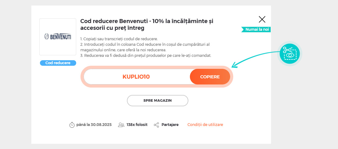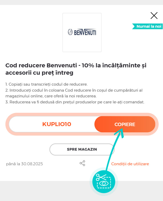 Copiați sau transcrieți cod reducere și faceți click pe butonul portocaliu „Transfer în magazin“, ulterior veți fi redirecționat direct în magazinul online Benvenuti.ro.