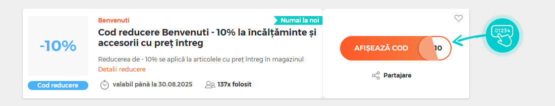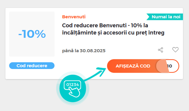 Valoarea reducerii: -10%Reducerea de 30% extra se aplică la încălțăminte din colecția Primăvară-Vară în magazinul online Benvenuti atunci când introduceți codul de reducere în coșul de cumpărături. Folosiți voucher Benvenuti și cumpărați încălțăminte mai ieftin.