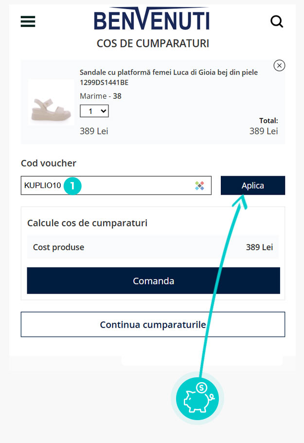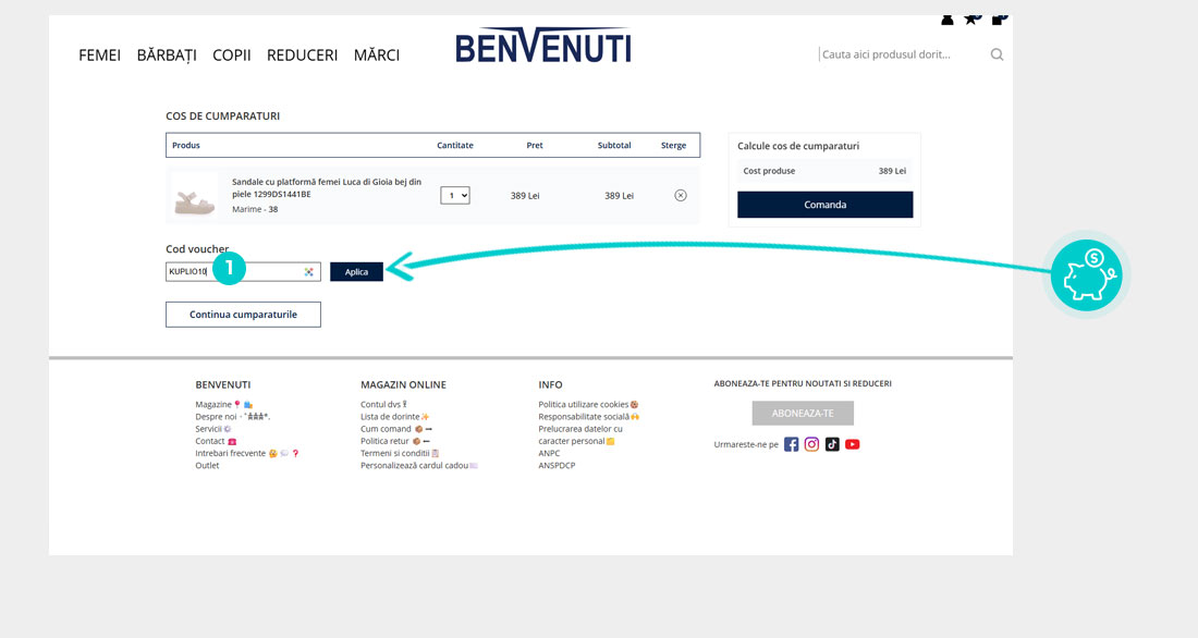 Alegeți produsul care vă interesează în magazinul online Benvenuti.ro apăsați butonul „Adaugă în coș” și produsul se va introduce în coșul de cumpărături. În coșul de cumpărături sub produsul ales de dumneavoastră se află o rubrică „Am voucher cadou sau un cod special“. Aici veți introduce cod reducere copiat sau îl transcrieți manual și confirmați prin butonul “Folosește“.