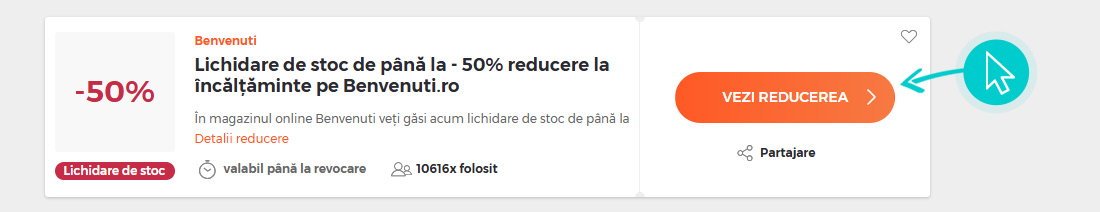 Alegeți o reducere Benvenuti.ro concretă de pe pagina noastră faceți click pe „Vezi reducerea“ și veți fi redirecționați în mod automat în magazinul online Benvenuti.ro direct la oferta promoțională, de unde puteți cumpăra produsul dorit la reducere.