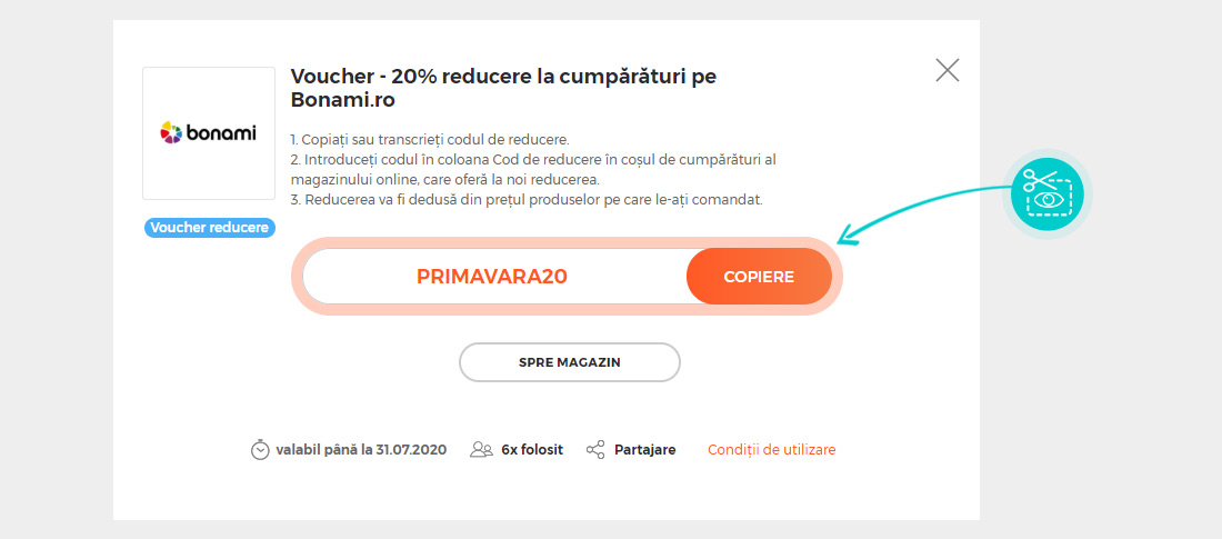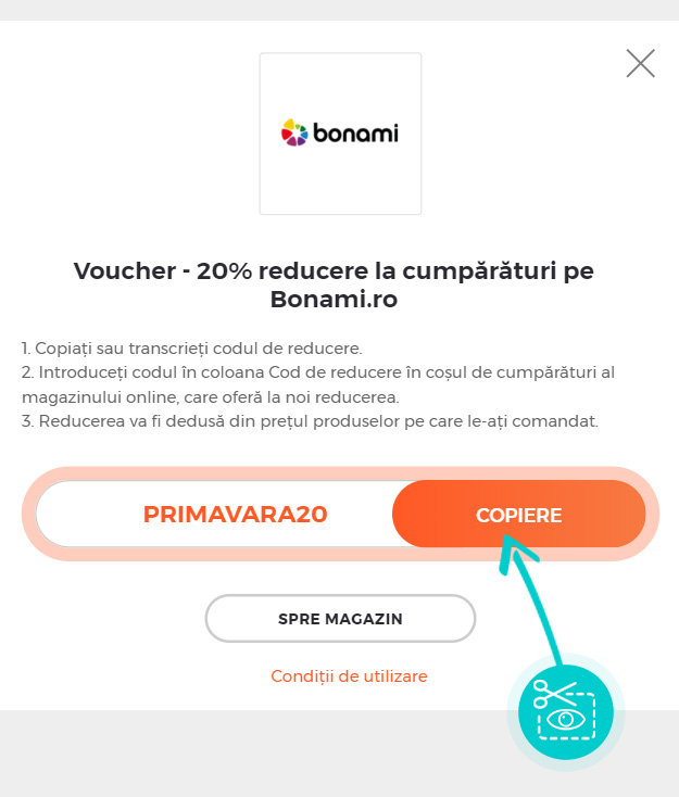 Copiați sau transcrieți cod reducere și faceți click pe butonul portocaliu „Transfer în magazin“, ulterior veți fi redirecționat direct în magazinul online Bonami.ro.