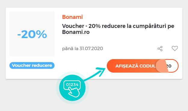 Selectați cod reducere concret de pe pagina noastră, pe care doriți să-l aplicați în magazinul online Bonami.ro. Faceți click pe butonul portocaliu „Afișează codul”.