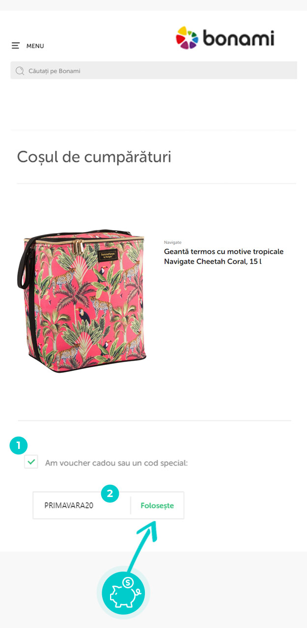 Alegeți produsul care vă interesează în magazinul online Bonami.ro apăsați butonul „Adaugă în coș” și produsul se va introduce în coșul de cumpărături. În coșul de cumpărături sub produsul ales de dumneavoastră se află o rubrică „Am voucher cadou sau un cod special“. Aici veți introduce cod reducere copiat sau îl transcrieți manual și confirmați prin butonul “Folosește“.