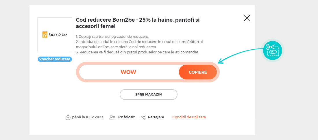 Selectați cod reducere concret de pe pagina noastră, pe care doriți să-l aplicați în magazinul online Born2be.ro. Faceți click pe butonul portocaliu „Afișează codul”.