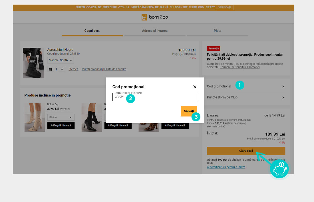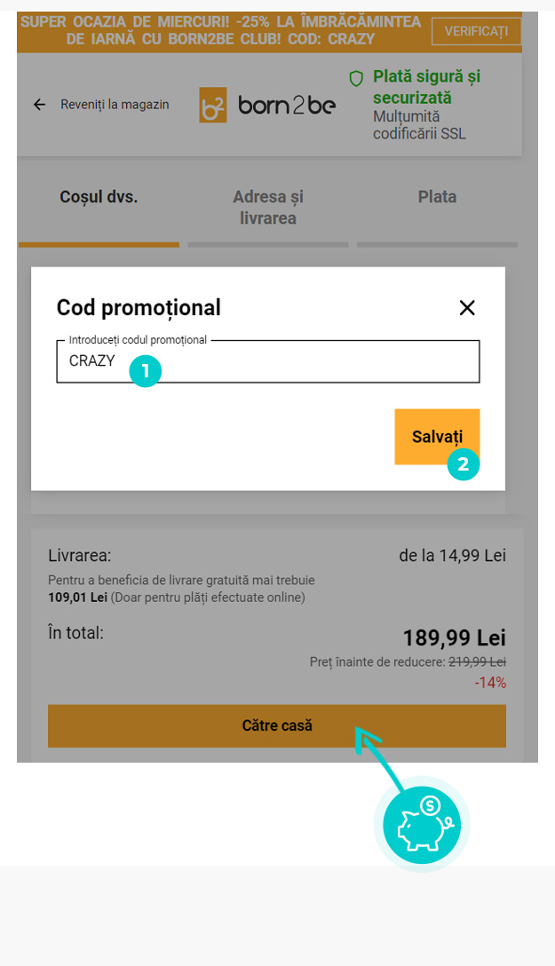 Alegeți produsul care vă interesează în magazinul online Born2be.ro apăsați butonul „Adaugă în coș” și produsul se va introduce automat în coșul de cumpărături. În coșul de cumpărături sub produsul ales de dumneavoastră se află o rubrică „Cod voucher“. Aici veți introduce codul de reducere copiat sau îl transcrieți manual și confirmați prin butonul “Aplică voucher“.