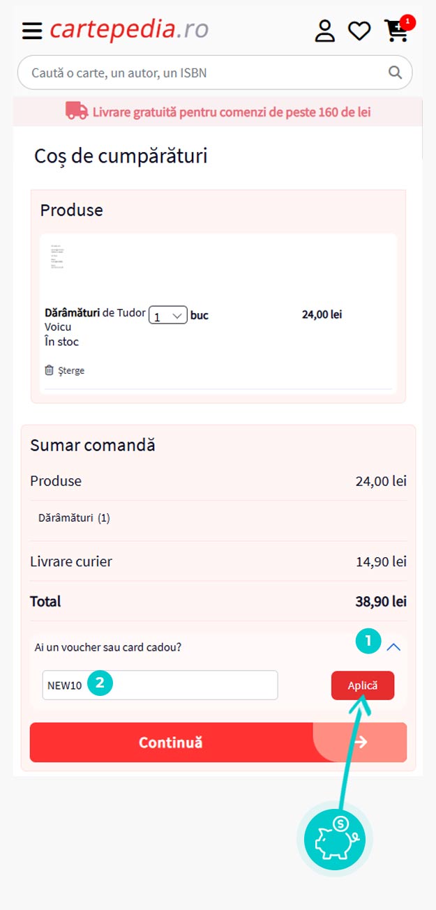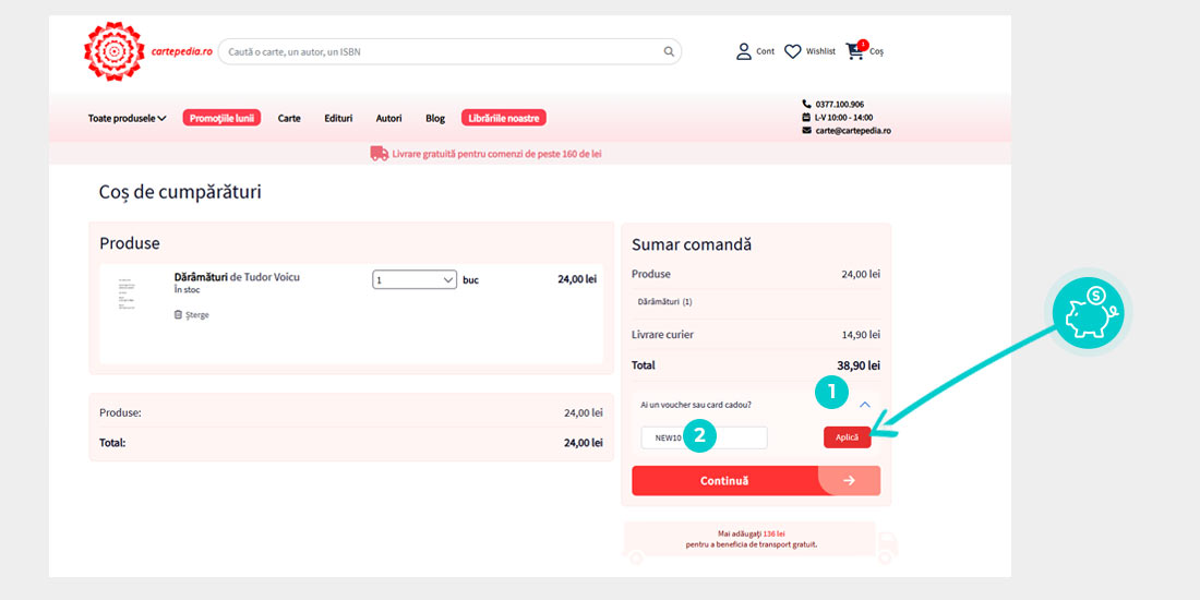Alegeți produsul care vă interesează în magazinul online Cartepedia.ro apăsați butonul „Adaugă la coș” și produsul se va introduce automat în coșul de cumpărături. În coșul de cumpărături sub produsul ales de dumneavoastră se află o rubrică „Am un cod promo“. Aici veți introduce cod reducere copiat sau îl transcrieți manual și confirmați prin butonul “Folosește“.