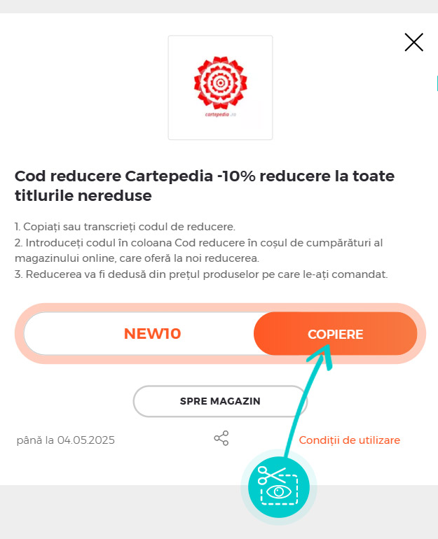 Copiați sau transcrieți cod reducere și faceți click pe butonul portocaliu „Transfer în magazin“, ulterior veți fi redirecționat direct în magazinul online Cartepedia.ro
