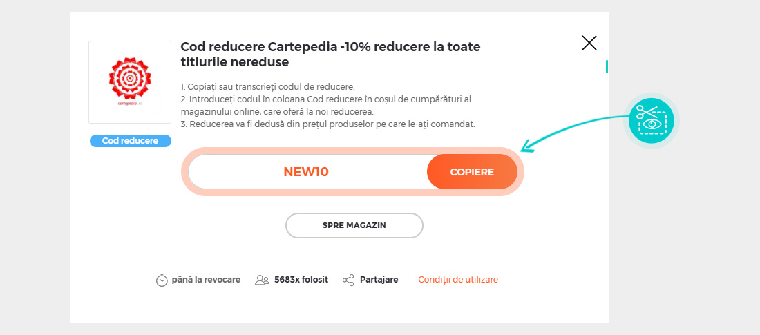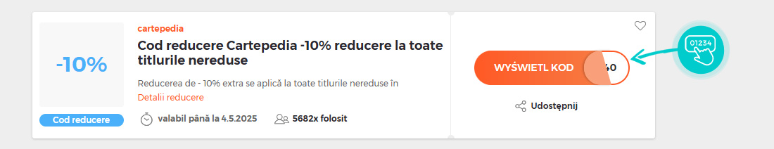 Selectați cod reducere concret de pe pagina noastră, pe care doriți să-l aplicați în magazinul online Cartepedia.ro. Faceți click pe butonul portocaliu „Afișează codul”.