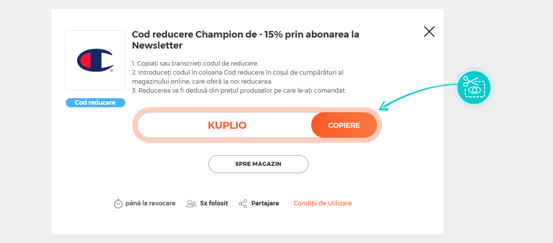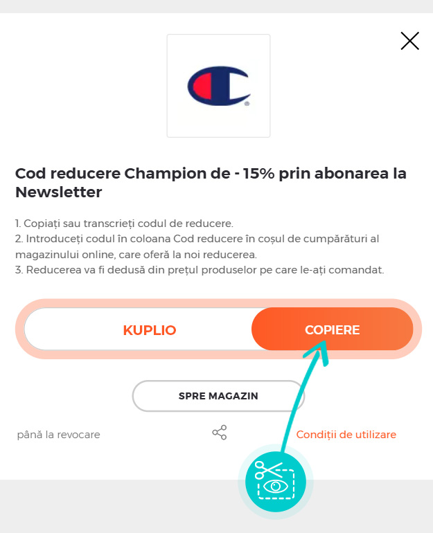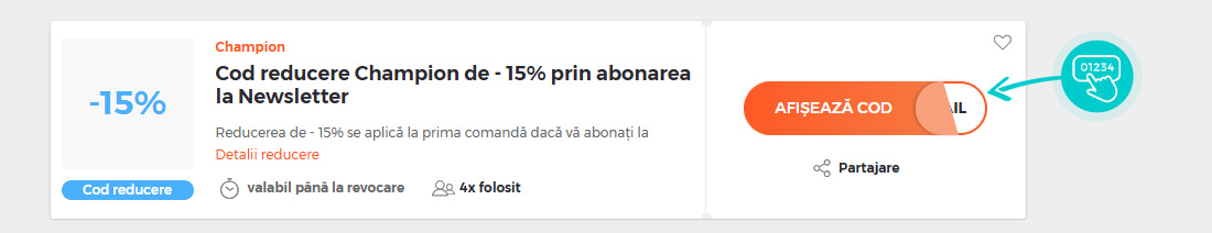 Selectați un cod reducere concret de pe pagina noastră, pe care doriți să-l aplicați în magazinul online Champion.com. Faceți click pe butonul portocaliu „Afișați codul”.