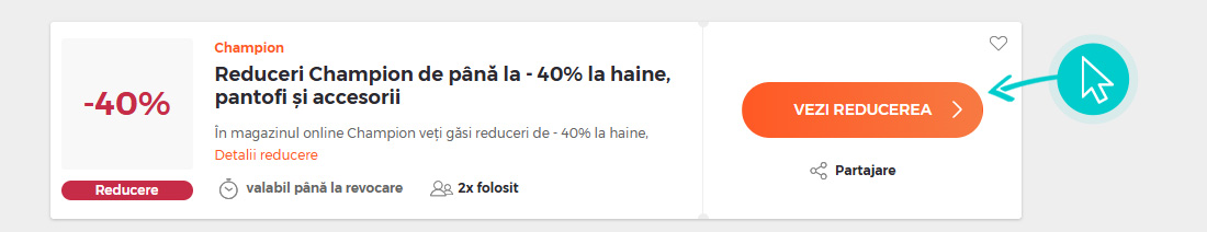 Alegeți o reducere Champion concretă de pe pagina noastră faceți click pe „Vezi reducerea“ și veți fi redirecționați în mod automat în magazinul online Chamipon.com direct la oferta promoțională, de unde puteți cumpăra produsul dorit la reducere.