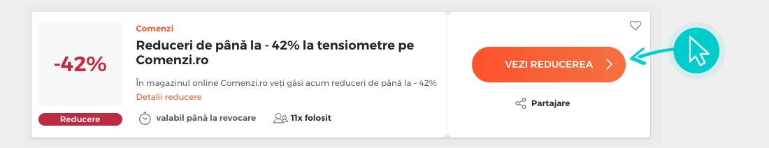 Alegeți o reducere Comenzi.ro concretă de pe pagina noastră faceți click pe „Vezi reducerea“ și veți fi redirecționați în mod automat în magazinul online Comenzi.ro direct la oferta promoțională, de unde puteți cumpăra produsul dorit la reducere.