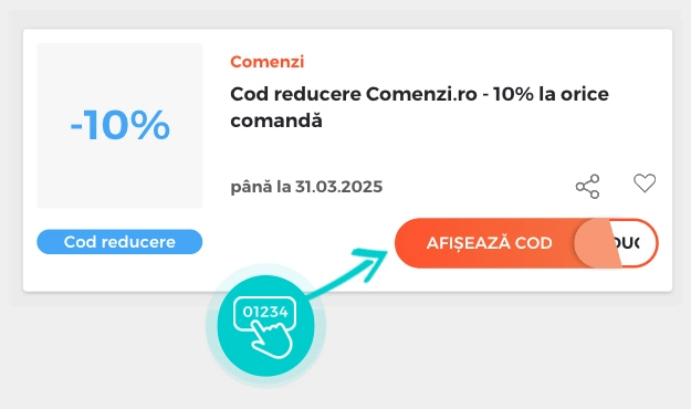 Valoarea reducerii: -10%Reducerea de - 10% se aplică la la plata cu cardul în magazinul online Comenzi.ro atunci când introduceți codul de reducere în coșul de cumpărături. Folosiți voucher Comenzi.ro și cumpărați