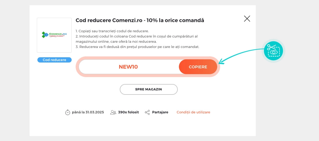 Copiați sau transcrieți cod reducere și faceți click pe butonul portocaliu „Transfer în magazin“, ulterior veți fi redirecționat direct în magazinul online Comenzi.ro