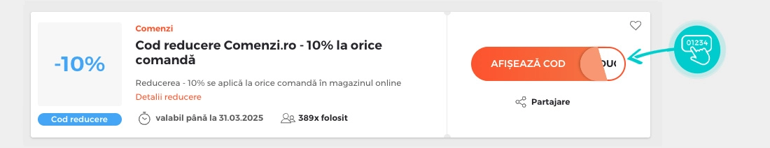 Selectați cod reducere concret de pe pagina noastră, pe care doriți să-l aplicați în magazinul online Comenzi.ro. Faceți click pe butonul portocaliu „Afișează codul”.