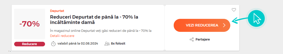 Alegeți o reducere Depurtat concretă de pe pagina noastră faceți click pe „Vezi reducerea“ și veți fi redirecționați în mod automat în magazinul online Depurtat.ro direct la oferta promoțională, de unde puteți cumpăra produsul dorit la reducere.