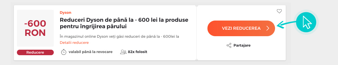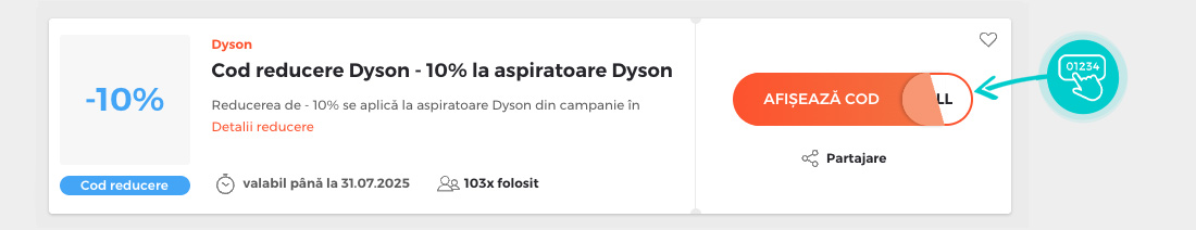 Selectați cod reducere concret de pe pagina noastră, pe care doriți să-l aplicați în magazinul online Dyson.ro. Faceți click pe butonul portocaliu „Afișează codul”.