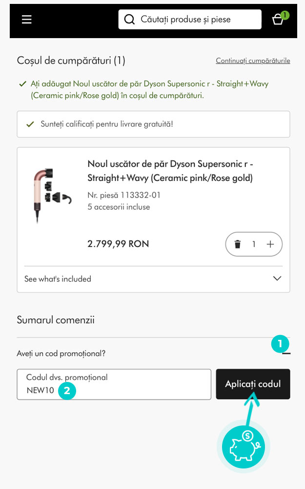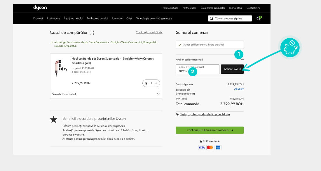 Alegeți produsul care vă interesează în magazinul online Dyson.ro apăsați butonul „Adaugă în coș” și produsul se va introduce în coșul de cumpărături. În coșul de cumpărături sub produsul ales de dumneavoastră se află o rubrică „Ai un voucher cadou sau cod de reducere? Folosește-l “. Aici veți introduce codul de reducere copiat sau îl transcrieți manual și confirmați prin butonul “Aplică“.