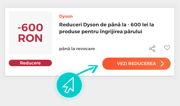 Alegeți o reducere Dyson concretă de pe pagina noastră faceți click pe „Vezi reducerea“ și veți fi redirecționați în mod automat în magazinul online Dyson.ro direct la oferta promoțională, de unde puteți cumpăra produsul dorit la reducere.