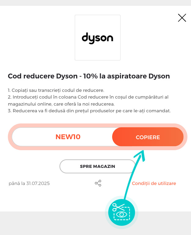 Copiați sau transcrieți cod reducere și faceți click pe butonul portocaliu „Transfer în magazin“, ulterior veți fi redirecționat direct în magazinul online Dyson.ro.