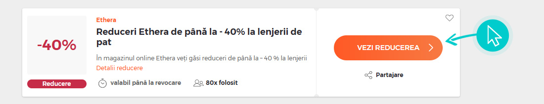 Alegeți o reducere Ethera concretă de pe pagina noastră faceți click pe „Vezi reducerea“ și veți fi redirecționați în mod automat în magazinul online Ethera.ro direct la oferta promoțională, de unde puteți cumpăra produsul dorit la reducere.