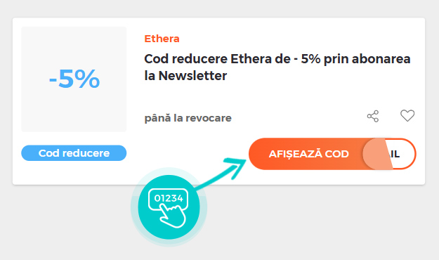 Selectați cod reducere concret de pe pagina noastră, pe care doriți să-l aplicați în magazinul online Ethera.ro. Faceți click pe butonul portocaliu „Afișează codul”.