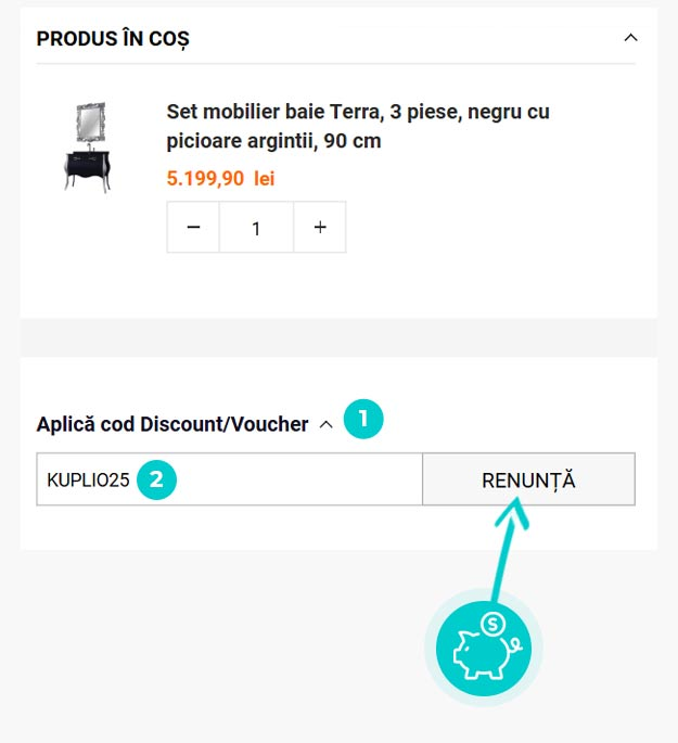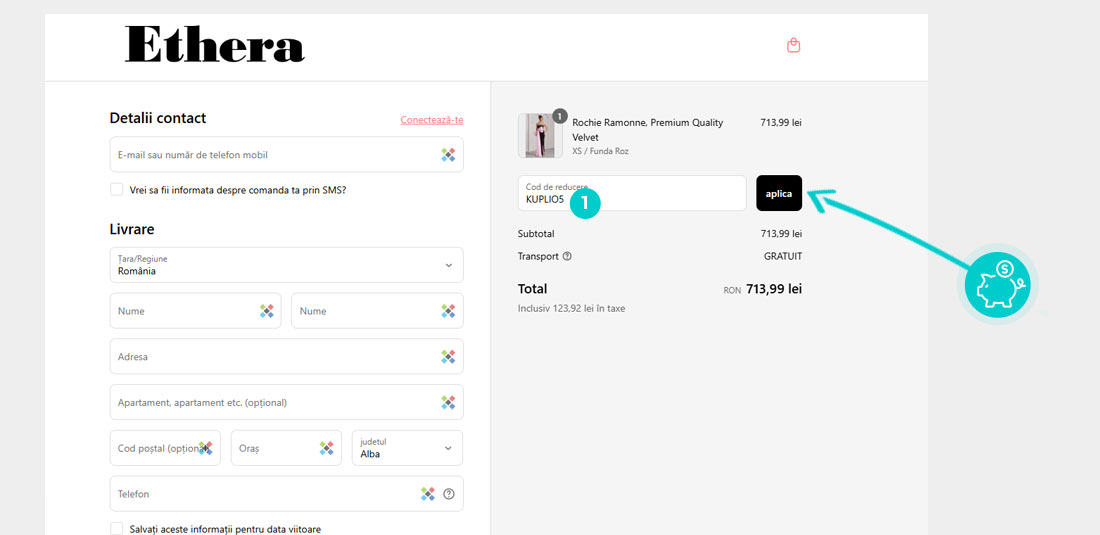 Alegeți produsul care vă interesează în magazinul online Ethera apăsați butonul „Adaugă în coș” și produsul se va introduce automat în coșul de cumpărături. În coșul de cumpărături sub produsul ales de dumneavoastră se află o rubrică „Cod voucher“. Aici veți introduce codul de reducere copiat sau îl transcrieți manual și confirmați prin butonul “Aplică voucher“.