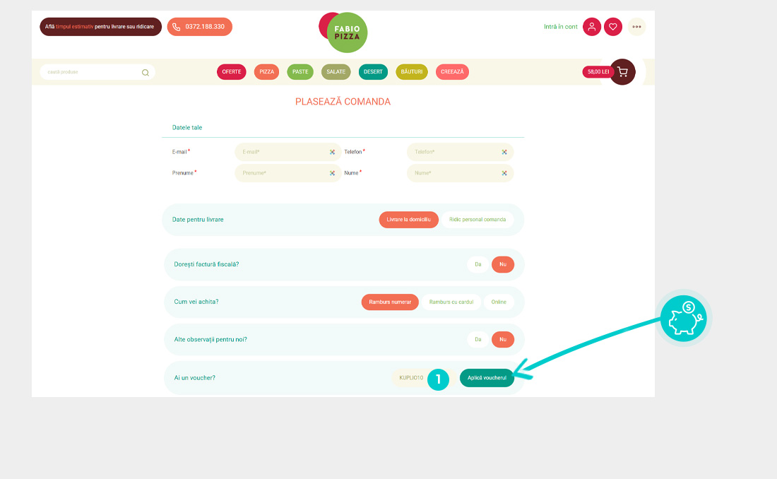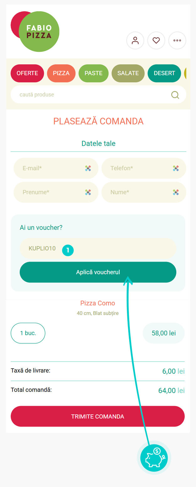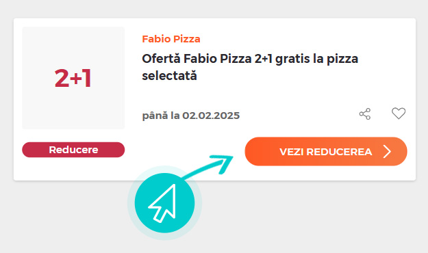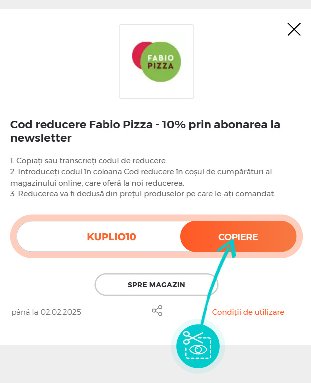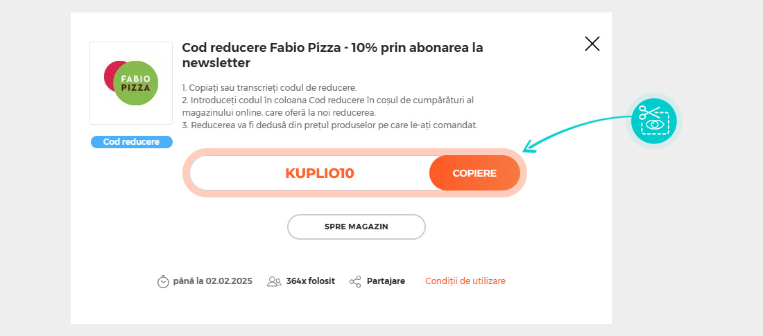 Copiați sau transcrieți codul de reducere și faceți click pe butonul portocaliu „Transfer în magazin“, ulterior veți fi redirecționat direct în magazinul online Fabiopizza.ro.