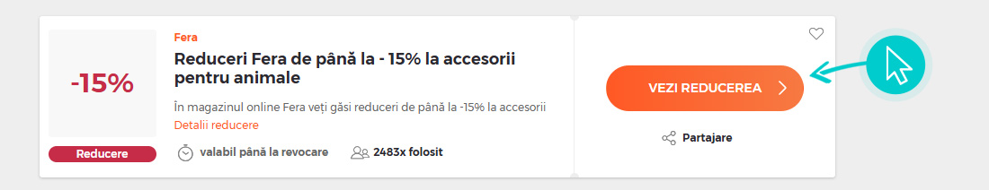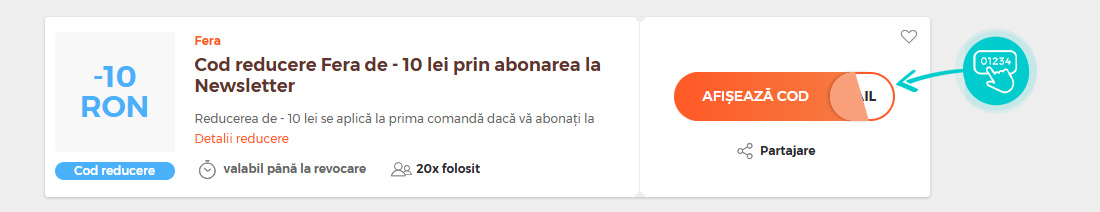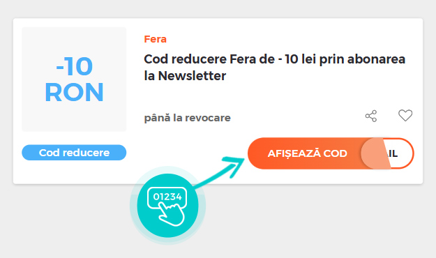 Selectați cod reducere concret de pe pagina noastră, pe care doriți să-l aplicați în magazinul online Fera.ro. Faceți click pe butonul portocaliu „Afișează codul”.