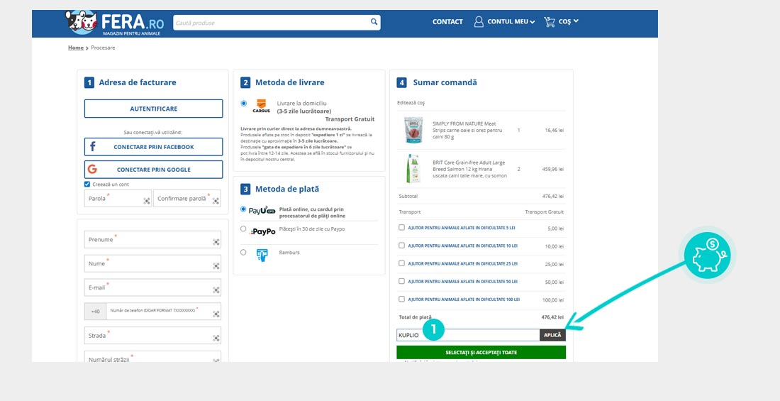 Copiați sau transcrieți cod reducere și faceți click pe butonul portocaliu „Transfer în magazin“, ulterior veți fi redirecționat direct în magazinul online Fera.ro.
