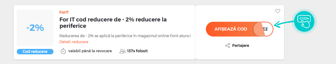 Selectați cod reducere concret de pe pagina noastră, pe care doriți să-l aplicați în magazinul online ForIT. Faceți click pe butonul portocaliu „Afișează codul”.