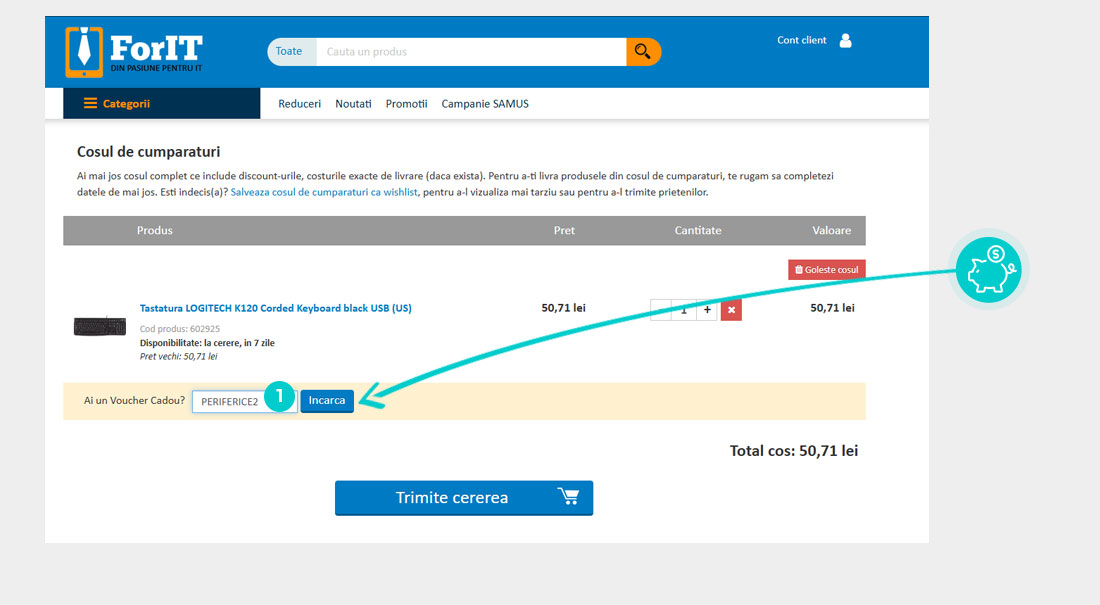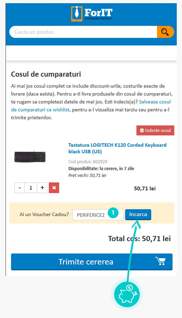 Alegeți produsul care vă interesează în magazinul online ForIT apăsați butonul „Adaugă în coș” și produsul se va introduce automat în coșul de cumpărături. În coșul de cumpărături sub produsul ales de dumneavoastră se află o rubrică „Ai un Voucher Cadou? Introdu codul aici“. Aici veți introduce cod reducere copiat sau îl transcrieți manual și confirmați prin butonul “Încarcă“.