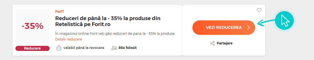 Alegeți o reducere ForIT concretă de pe pagina noastră faceți click pe „Vezi reducerea“ și veți fi redirecționați în mod automat în magazinul online ForIT direct la oferta promoțională, de unde puteți cumpăra produsul dorit la reducere.