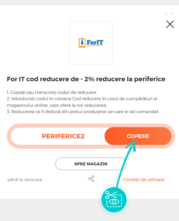 Copiați sau transcrieți cod reducere și faceți click pe butonul portocaliu „Transfer în magazin“, ulterior veți fi redirecționat direct în magazinul online ForIT.