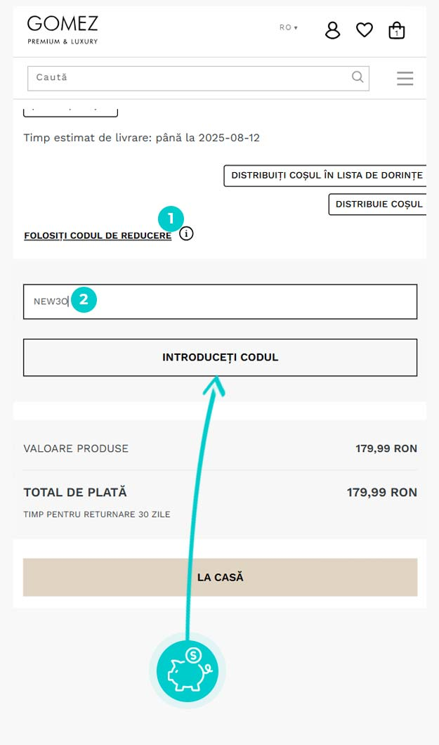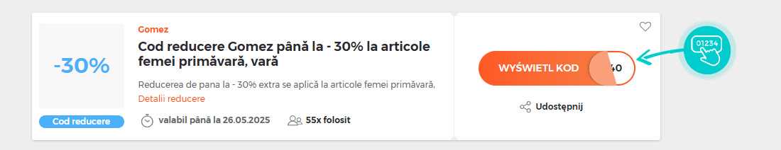 Alegeți cod reducere pe care doriți să îl utilizați în magazinul online Gomez. Faceți clic pe butonul portocaliu „Aplicați codul”
