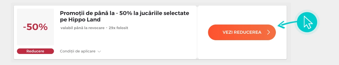 Alegeți o reducere Hippoland concretă de pe pagina noastră faceți click pe „Vezi reducerea“ și veți fi redirecționați în mod automat în magazinul online Hippoland direct la oferta promoțională, de unde puteți cumpăra produsul dorit la reducere.