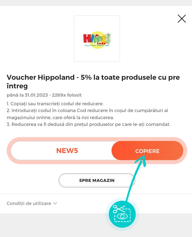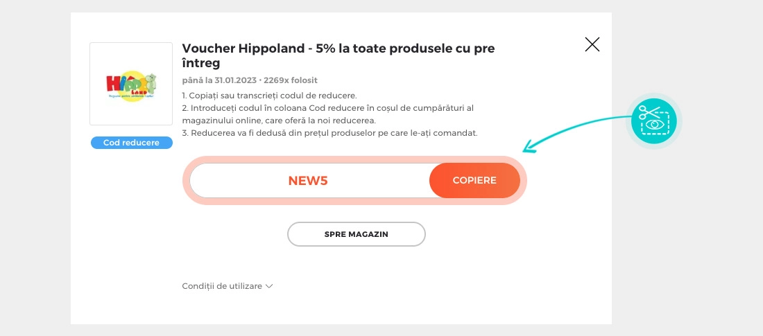 Copiați sau transcrieți codul reducere și faceți click pe butonul portocaliu „Transfer în magazin“, ulterior veți fi redirecționat direct în magazinul online Hippoland.