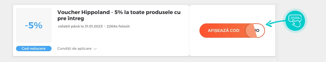 Selectați codul reducere concret de pe pagina noastră, pe care doriți să-l aplicați în magazinul online Hippoland. Faceți click pe butonul portocaliu „Afișează codul”.