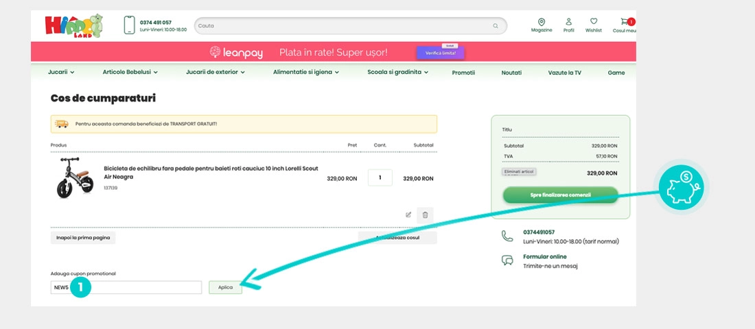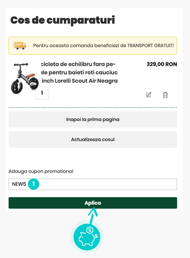 Alegeți produsul care vă interesează în magazinul online Hippoland apăsați butonul „Adaugă în coș” și produsul se va introduce automat în coșul de cumpărături. În coșul de cumpărături sub produsul ales de dumneavoastră se află o rubrică „Cod voucher“. Aici veți introduce codul reducere copiat sau îl transcrieți manual și confirmați prin butonul “Aplică voucher“.